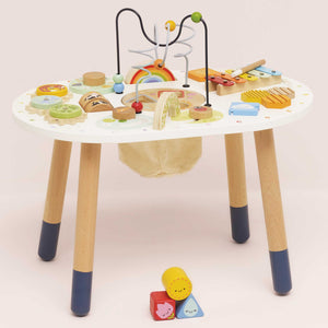 This incredible activity table is a feast for the eyes and the senses, making it the perfect hands on toy for toddlers and developing imaginations. Packed with a host of multi-sensory features to engage young, curious minds. Let them explore this amazing playground of discovery from the bead maze, shape sorter, xylophone, scratch board, turning gears and cogs, spinning rattle and more!