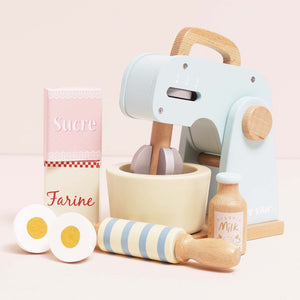 Mini bakers will enjoy mixing up a real showstopper of a dessert with the Honeybake Mixer Set, full of fun and ready for play. Featuring a realistic moving whisk, wooden rolling pin, bottle of milk and bowl. This delightful retro style toy is painted in pretty pastel colours and comes complete with ingredients too: a bag of flour, sugar and eggs.