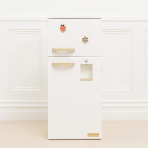 Upgrade your dream kitchen set up with this stunning freestanding fridge freezer unit. Made from FSC®-certified wood, with an appealing retro style design, this durable toy is jam packed with interactive features for inspired role play fun. Discover the built in water dispenser, temperature control and fruit and veg compartments for stocking up on their five a day. Complete with a host of accessories including 2 ice lollies and stand, egg and ice trays plus a milk and smoothie bottle. The freezer door is magnetic, plus there are two handy fridge magnets for realistic play value. compatible with our large kitchen as well as our extensive collection of play food and accessories.